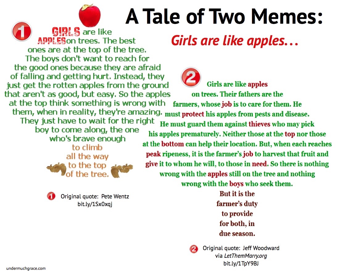 More commentary on girls and apples will be forthcoming in a day or two, but this context should shed some light on the intent of the author of meme #2. It was actually a response to meme #1. (Thanks to a reader named Ezzy at No Longer Quivering for information on the first meme.)It's still patriarchal, objectifies girls (and seems to imply that it is true of all women), but at least it makes a bit more sense in context.